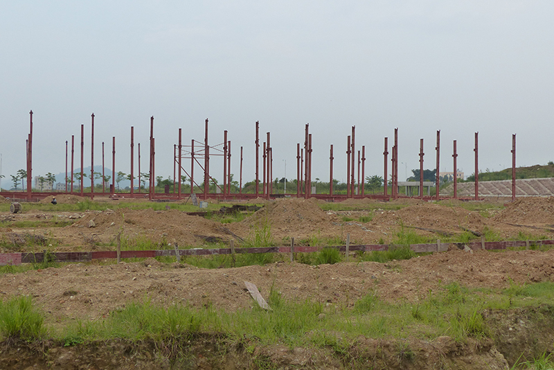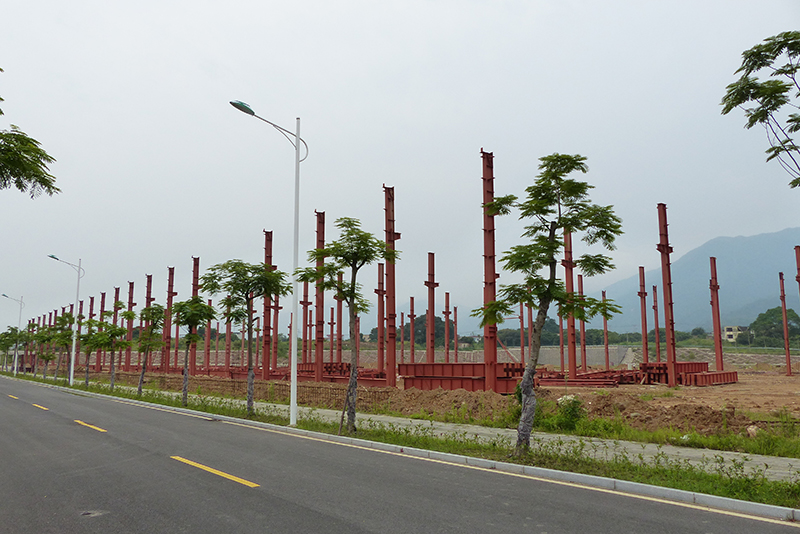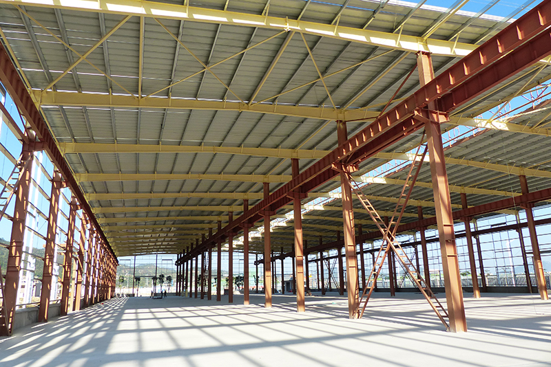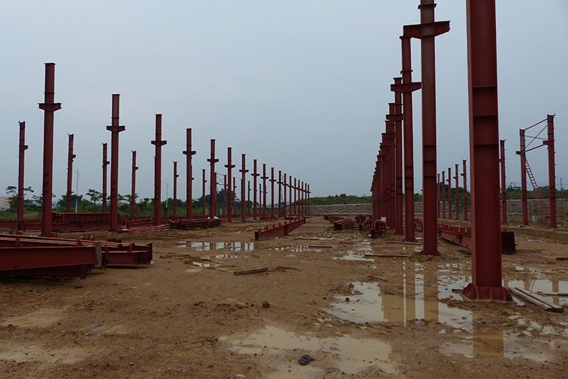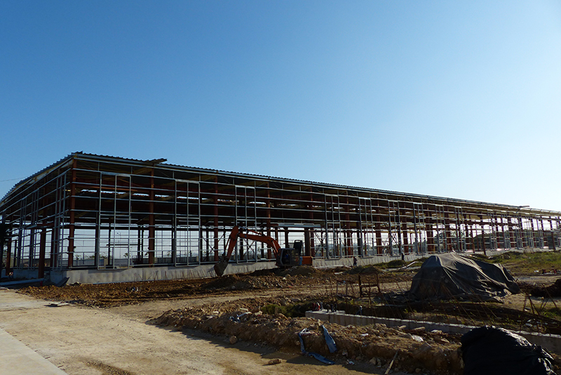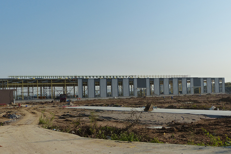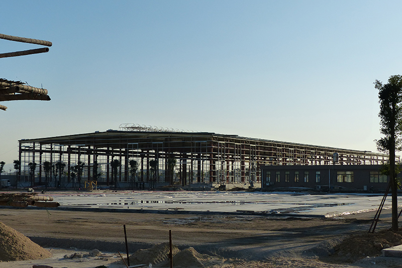 2016年12月9日,钢结构框架整体搭建完毕,进入外墙及屋顶搭建,堆场也铺设完成。